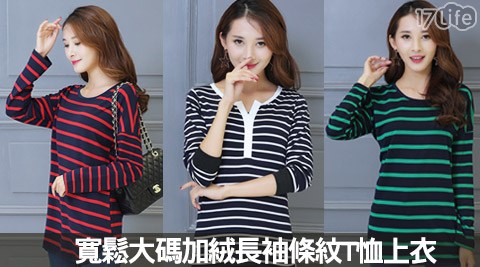 新上市 寬鬆大碼加絨長袖條紋T恤上衣-超值推