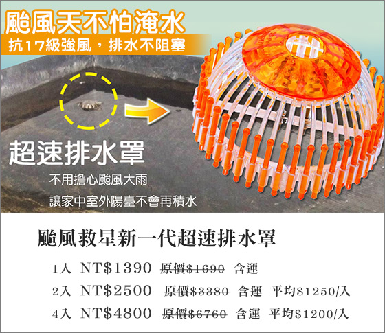 平均每入最低只要1200元起(含運)即可購得颱風救星新一代超速排水罩1入/2入/4入。